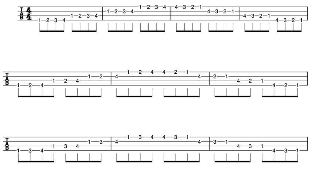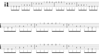 ゆっくりとしたテンポから、確実にフレットを押さえる感覚を養います。