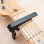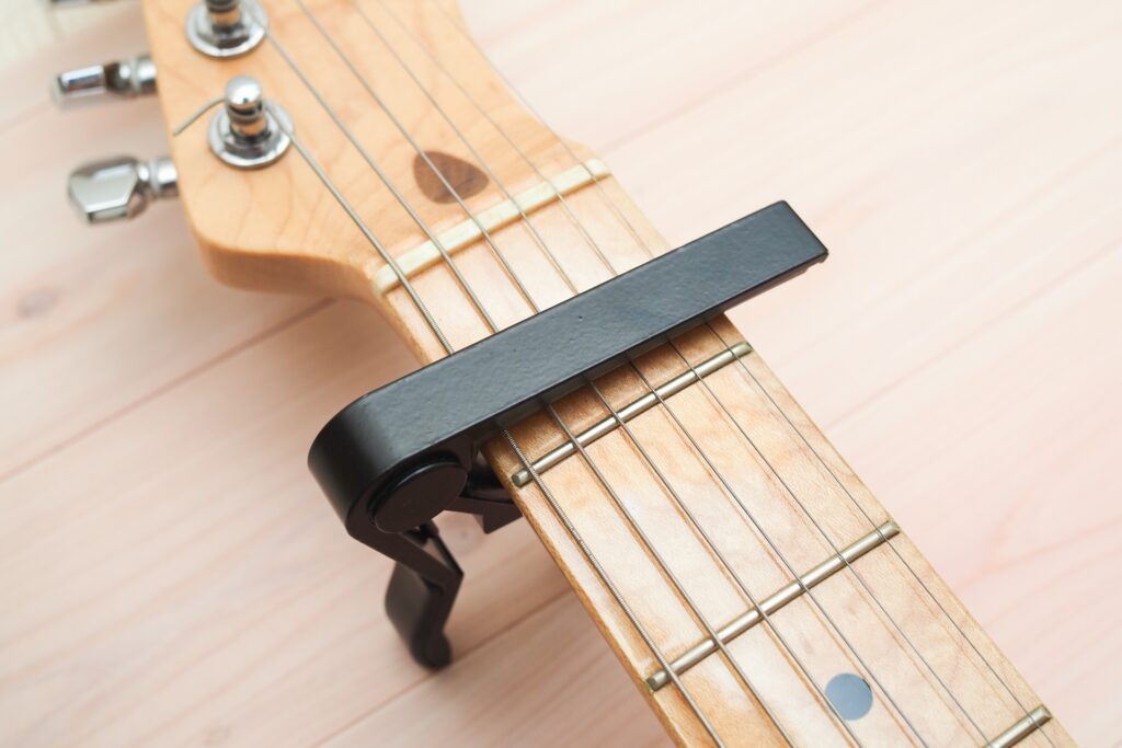 ギターのネックに挟むことで、全体の音程を上げることができ、難しい曲を簡単なコードフォームで弾けるようになります。